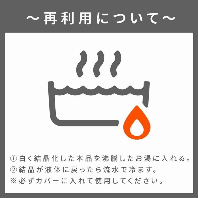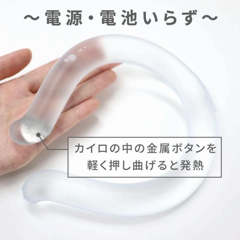 ・カイロの中の液体が白く結晶化しながら発熱するので、温まり始めたらカバーに入れ、首にかけて使用してください。